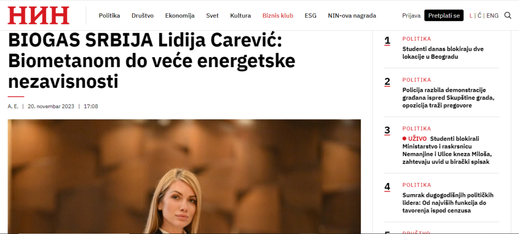 Interview with the manager of the Serbian Biogas Association, Lidija Carević, in the magazine NIN.