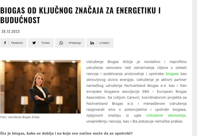 Interview with the Manager of the Serbian Biogas Association Lidija Carević in press Energetski portal